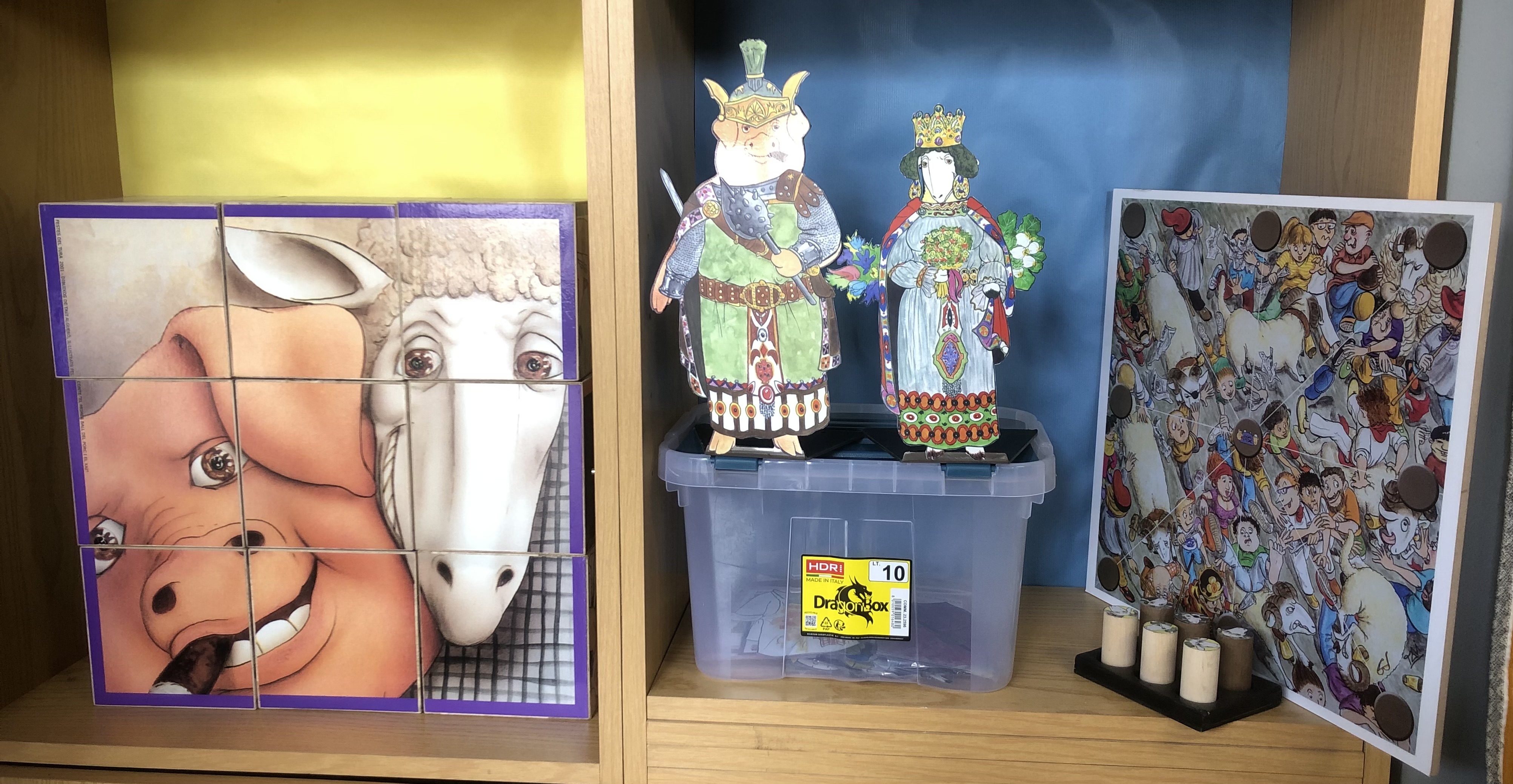 - Joc de trencaclosques compost per 9 cubs de fusta. Les imatges del trencaclosques són 6 il·lustracions del conte “El primer ball del Porc i el Xai”.